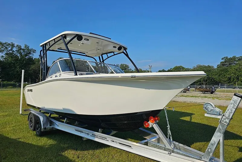 This White and Black Sea Pro 240 Dual Console SPORT has a SUZUKI DF300 APX5 outboard motor.