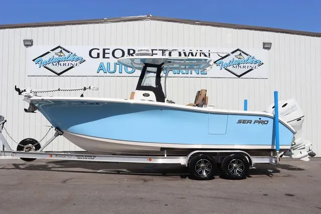 2023 Sea Pro 259 Deep V Series, 2023 Sea Pro in Carolina Blue Hull Color (upgrade) and underside Hard top. MOTORS WARRANTY IS GOOD till 10-21-2027Upholstery is Cafe Brown. Fiberglass Leaning Post w/2nd Livewell & Tackle Center, GG Schmitt Rear Bench Seat, Tilt Hydraulic Steering w/Optimus EPS, Autopilot, Windlass Anchor w/Rope, Chain, Freshwater Shower(20 gallon), Side entry tuna door, Rear Boarding Ladder, Trim Tabs, Port & Starboard Fish Boxes Macerated, Fiberglass Hard top, Gull Wings, Mooring Cover, Helm Pad Teak, Battery Charging System, Audison DLX stereo system with Amp, Sub, & 6 Speakers, Complete Bolster Package, Forward Seating Removable Backrests, Outriggers GS280 w/15" Poles and reigging kit, Pump Out Head with Overboard Discharge, Recessed Rod Storage Ruler Pad, Removable Bow Table w/Cushion, Underwater Lights, 2 Simrad NSS12 evo3S Combo, VHF Marine Radio, Sirius XM Weather Module, Simrad Halo 20+Radar, Minn Kota 87in Ipilot Trolling Motor Package w/Lithium Battery Upgrade, LED Light Bar, 27 Rod Holders Total w/6 being rod/c
