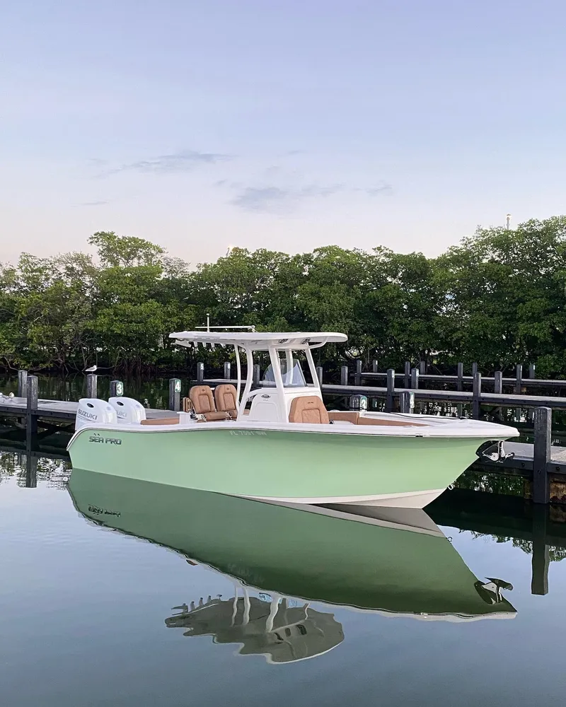 This 2021 Sea Pro 259 DLX is powered by twin Suzuki 200 hp four stroke outboards showing approximately 40 hours. The boat features white decks with a Sea Foam gelcoat exterior finish and brown upholstery. This vessel has been dry stored on a trailer (included) under a full mooring cover at the owners home. This center console has all the creature comforts and fishing features boaters care about most, combined with the reliability of two motors and modern technology.
