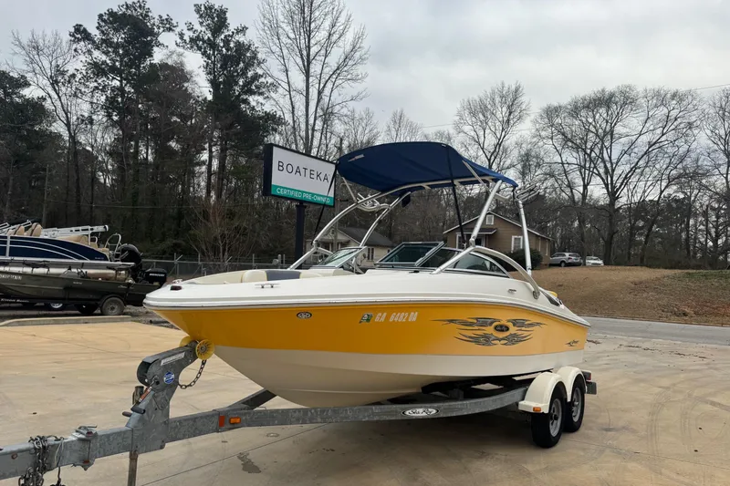 Available in a variety of dynamic new colors, this spirited 195 Sport includes the innovative Turn-Key Starting (TKS) system, standard extended swim platform, full sun pad, and ski and wakeboard storage with heavy-duty vinyl matting. A custom-fitted tandem axle trailer comes standard, complete with surge brakes and swing-away tongue.