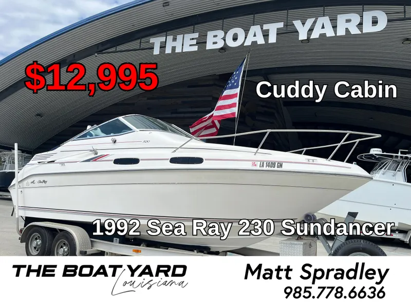 Call Matt for Availability or Appt:985-778-6636boatyardmatt@gmail.com1992 Sea Ray 230 SundancerMerCruiser 5.0L V8Tandem Axle Trailer w/ Spare+Cuddy Cabin w/ 2 Beds, Head, & Kitchenette+New Lenco Electric Trim Tabs+Bimini Top+Updated Garmin GPS+VHF+On-Board Battery Charger+Perko Battery Switch+Ice Chest Seats (2)+Swim LadderALL TIRES AND TRAILER HARDWARE REPLACED RECENTLY***FINANCING AVAILABLE******TRADES ACCEPTED***