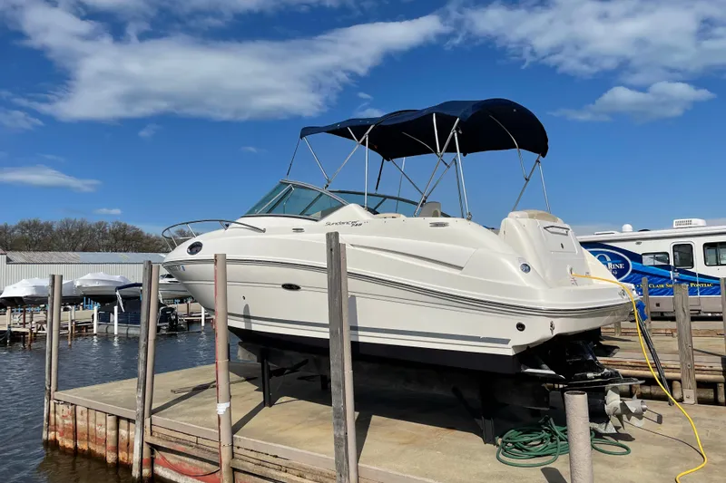 The 240 Sundancer is a grand step into Sea Ray's world-renowned family of raised helm, mid-cabin stateroom designed cruisers. The ingenious cabin layout encompasses plentiful storage, gorgeous cherry wood cabinetry and four color-coordinated fabric design package choices. Outside, the functional cockpit is designed for versatility and entertainment for fun while docked or underway. At first glace she may appear as a large-scale cruiser, but she's still trailerable with an 8' 6" beam.