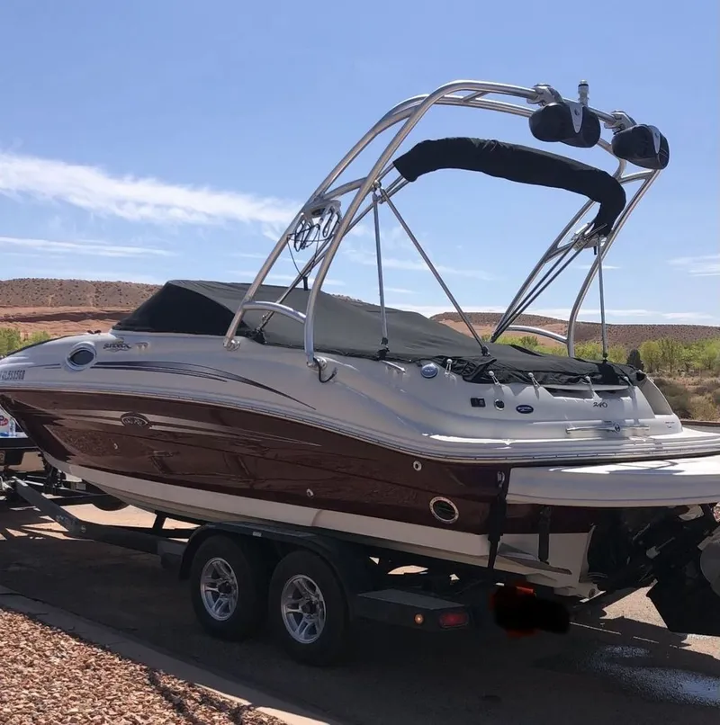 Owned by a meticulous second owner, the boat has benefited from recent mechanical updates and tasteful upgrades, including a premium stereo system, ski tower, and new cooling intake. Stored under cover since ownership and maintained through a dealership, this 240 Sundeck stands out well above average for its year.
