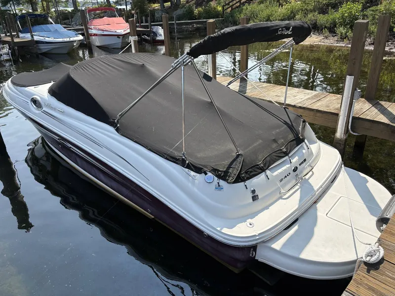 This beautiful lightly used 2008 Sea Ray 240 Sundeck is powered by a mercury 350mag engine with only 504 engine hours on it. The boat has a Bimini top with matching bow and cockpit cover, snap in carpets, a pump out head, sink, rear extended swim platform, rear swim ladder, rear wash down sprayer and tons more, this boat has plenty of seating for all your friends and family. In fact, this boat is great for family outings or groups of friends - it can easily fit 8-12 people comfortably. Also good for day trips, cruising, swimming, watersports, entertaining, or even a relaxed day at anchor. Plenty of storage options, onboard head, wet bar, swim platform, bucket seats + lounge seating make it a "do-everything" boat: a mix of fun, comfort, utility. This boat can be seen at our Laconia location. Call 603-524-6661 for more information or to schedule a showing inside our heated indoor showroom today!