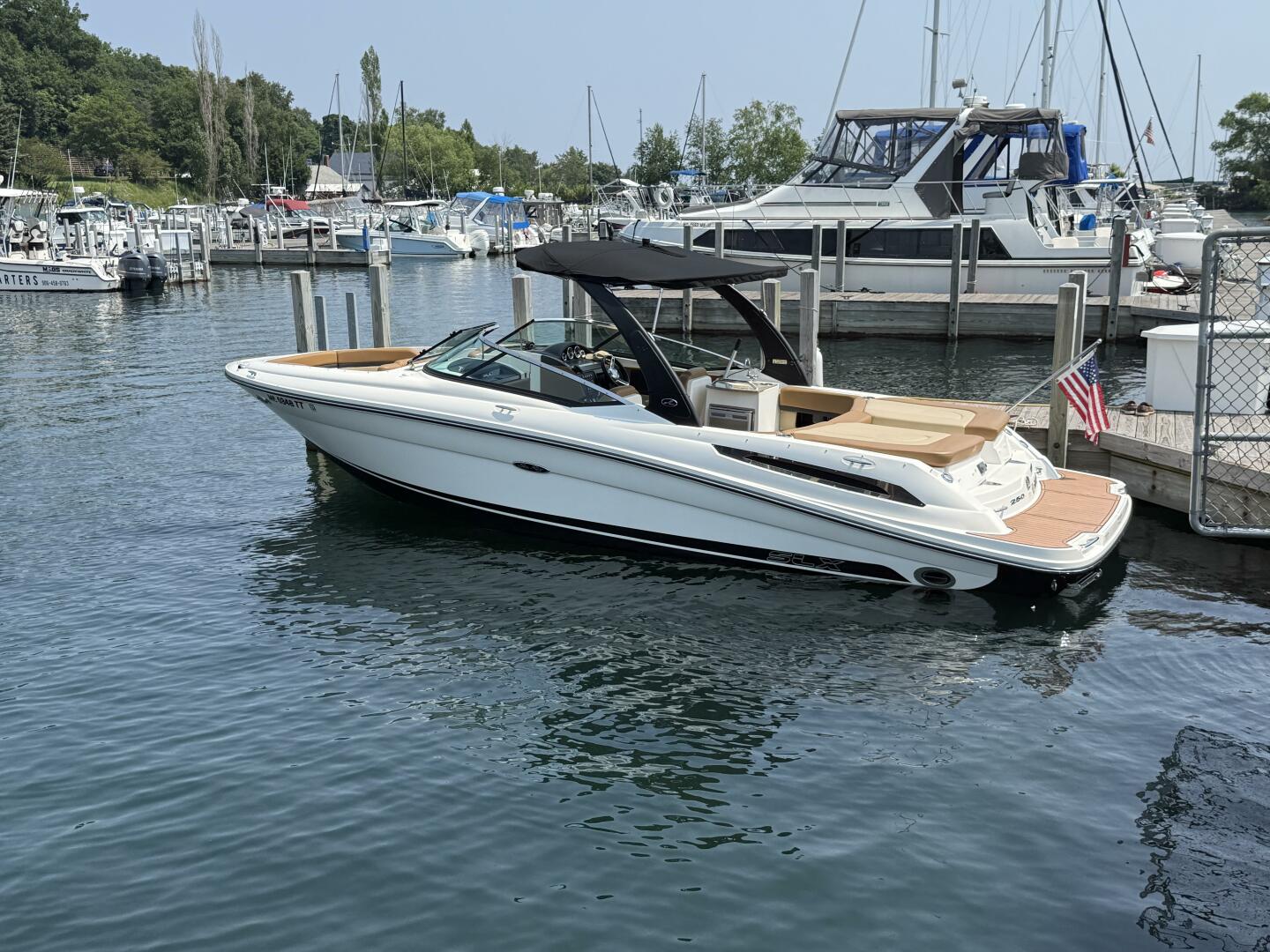Welcome aboard this like-new, one-owner Sea Ray 250 SLX with only 370 hours! This premium, sophisticated sport boat was built for luxury cruising as well as high performance with room for the entire family! Powered with the optional big-block MerCruiser 8.2L ECT Bravo III delivers 380 hp. This optional powertrain provides both exhilarating speed and smooth handing. This 250 SLX employs Sea Ray's proprietary 'Quiet Ride' construction that reduces sound levels 25-50%, furthering the premium dynamics of this boat. Whether you are skiing or tubing, or just out for a sunset cruise, this Sea Ray 250 SLX promises an experience like no other. Sea Ray has a solid reputation associated with attention to detail, quality and craftsmanship. The 250 SLX features a spacious cockpit, plush two-tone seating, and upscale finishes that surround you. That coupled with a multi speaker Fusion Bluetooth stereo system, offers a luxury experience and excitement with every adventure. Need storage? No problem! The SLX 250 features a ski locker as well as storage under many of the seating areas as well. This SLX features many amenities not normally associated with a sport boat. Conveniences such as a refrigerator, sink & wet bar, and an enclosed head, provides many conveniences for an uninterrupted day on the water. This 250 SLX also comes with several upgrades including a collapsible arch tower and attachable bimini top, Raymarine chartplotter, a Standard Horizon GX1600 25 VHF/FM marine radio and much more. After your day on the water, your SLX can be protected with either the bow and cockpit covers or the mooring/tow covers- all included. Additionally, a custom 2016 Phoenix tri-axle trailer with both an electric and manual jacks is included.