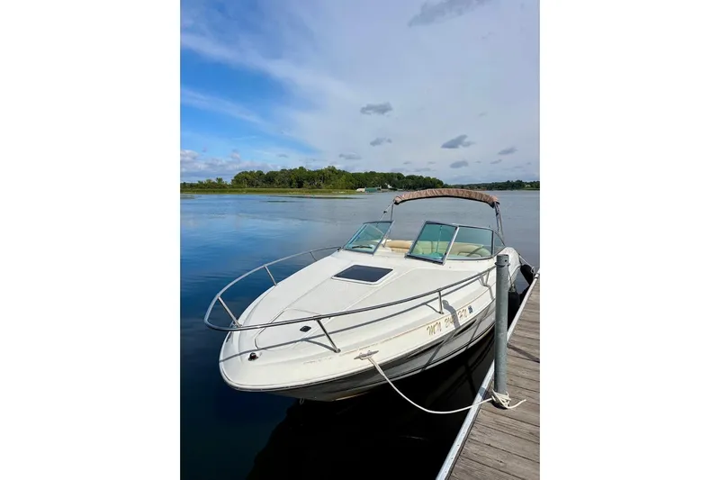 Power is provided by a Mercruiser 7.4 liter MPi 310 Hp engine linked to a Bravo III sterndrive which will take you and the crew wherever you want to be. Features include: Dual batteries with switch, Kenwood Sirius Ready sound system with aux. input and four speakers, Lowrance 3500 depth finder, Ritchie compass, windshield wiper, Halon automatic fire suppression system, trim tabs, tilt wheel, cockpit lighting, instrument lighting dimmer dial, 12 volt accessory power source at the helm, original owner's packet with manuals, cockpit sink with self-draining recessed ice bin, large in-floor locker, two person helm seat with flip-up bolster, cockpit console with beverage holders and storage cabinet, cabin door with molded steps, walk-thru windshield, bow anchor locker with anchor and line, spacious cuddy (convertible pedestal table with filler cushions for v-berth), tinted overhead deck hatch with removable screen, storage compartment, 12 volt accessory power source, enclosed head ( porta-potty with deck top pump out), forward v-berth reading lights, aft u-shaped seating with newer upholstery, removable pedestal table, rear storage compartments, snap-in Berber cockpit carpet, beverage holders throughout boat, Bimini top with original full enclosure set all in excellent condition and in original canvas storage bag, cockpit cover, swim platform with concealed stainless steel telescoping three-step swim ladder, and transom fresh water washdown.