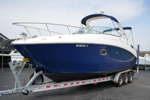 Motivated Seller! Clean and ready for the water! Under 300 hours on this 2009 Sea Ray 270 Sundancer powered by Mercruiser 6.2L DTS 320 hp, with SeaCore closed cooling.. Very well equipped with the following--Air and Heat, Shorepower, Smartcraft, Chartplotter, Raymarine Radar, VHF, Stereo with CD and XM ready, cockpit cover, bimini top with camper canvas, spotlight with dash remote, windlass, radar arch, swim ladder, trim tabs, tilt wheel steering, pump out head, refrig, stove, microwave, snap in cockpit carpet, 2022 Venture Tri Axle Trailer and more