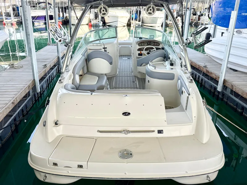 There is plenty of room for everyone in the spacious cockpit of the Sea Ray 270 Sundeck. One reason is the large gas-assisted storage hatch in the cockpit sole - it is big enough for skis, kneeboards, and other space-eating items. There are convenient tables for both the cockpit and bow. The portside enclosed head compartment has a lockable door, pump-out head, vanity with sink and mirror, lots of storage, and a stainless steel portlight for ventilation. A berth in the starboard helm not only allows a private catnap, it provides extra storage space as well. A portlight provides fresh air and natural light. The cockpit wet bar has a sink, faucet with pullout sprayer, built-in insulated cooler, beverage holders, and a large storage area underneath. Bow seating features sun loungers on both sides. And concealed swim ladders in both the bow and stern come in handy.