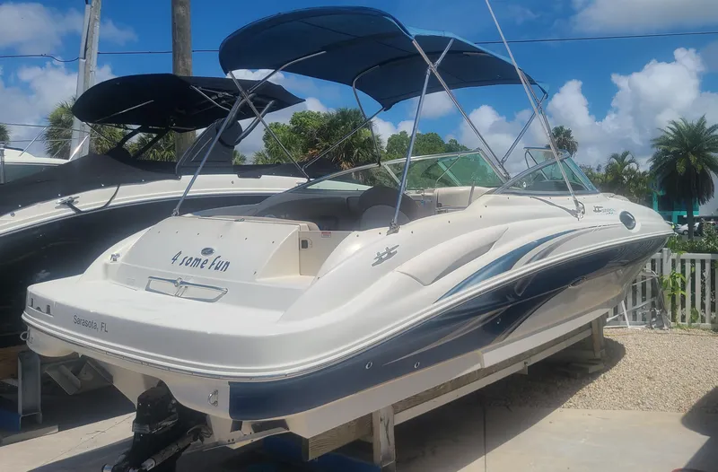 The 270 Sundeck is more than just a deck boat; it has features of a bowrider and rides like runabout cruiser! This 2004 is in excellent condition and powered by a newer Mercruiser 383 Stoker 350HP motor with only 229 hours of use. She has lots of comfortable loungers and seating, an enclosed head with a sink and storage, freshwater washdown, transom door and bow access, both with swim ladders. Includes covers, safety equipment, Garmin GPS (mount shown). Does not have a trailer, but we can help you find one or transport her to you.