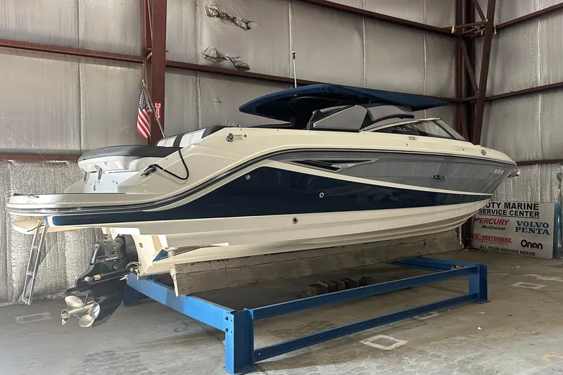 If you are looking for an awesome gentility used boat 28' with trailer, this is it!! Powered with a big block Mercruiser 8.2L with Bravo 3 outdrive. ONLY 267 HOURS!! This boat has always been professionally maintained! Always kept in heated storage during the off seasons & rack kept during the season. It includes a tri axle EZ Loader trailer which was custom built for this boat. No bottom paint.