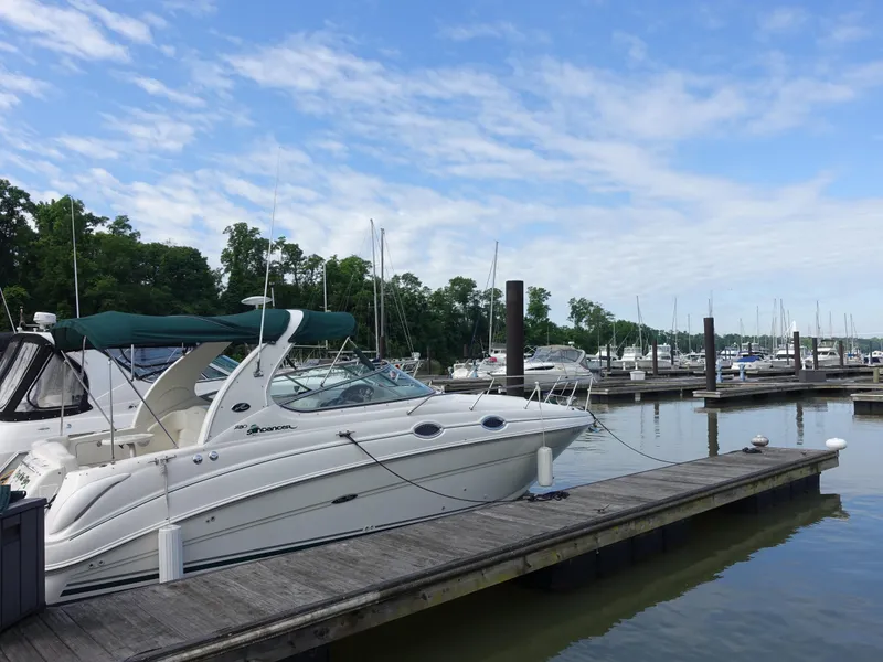 This 2004 Sea Ray is in EXCELLENT condition. Powered by single MerCruiser 496 with a original LOW 475 hours. Her cockpit offers ample seating for 6, all upholstery is in excellent condition, all systems are fully operational, newer cockpit carpeting, upon entering the cabin your greeted by a extremely clean environment, full size forward cabin for sleeping, dinette area mid cabin, Flat Screen TV, nice galley to offer refrigerator, stove and microwave. Her interior cherry finish is all in perfect condition. Head shower offers ample space for showering, and aft cabin can accommodate 2 additional guests for sleeping. New Bellows Shit cables and all fluids just changed. If you are looking for a turn key vessel look no further