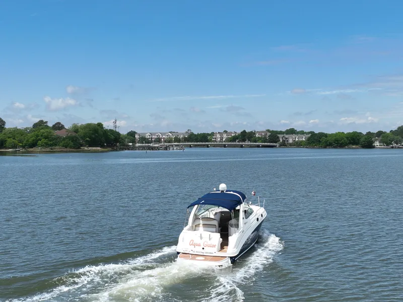 "AQUA GATOR" is very well equipped with all the right options & upgrades from AC/Heat, fully equipped galley with a dual voltage fridge, microwave & stove top, fresh water vacu-flush head, windlass anchor, remote search light, cockpit wet bar, extended swim platform w/SEADEK decking, and more!! Her layout offers a convertible berth forward that raises with a wood top table for versatility for entertaining or sleeping, aft there is a double berth, hanging closets in both areas, and a forward facing dinette that also converts to a berth for extra overnight guests. The galley has a dual voltage under counter fridge & freezer, recessed two burner electric cook top, a microwave, and plenty of storage!! There is an enclosed head with a vacu-flush toilet that uses fresh water allowing for an odor free cabin!! There are carpet runners throughout to protect the carpets as well, that are machine washable to keep fresh. Her cockpit is very versatile and comfortable for lounging & entertaining, with an aft bench seat, sun lounge seat to port, and captains chair at the helm. There is a wet bar with SS sink to stbd., a walk-thru door from the transom swim platform, and a walk-thru windshield to the bow for easy access to the foredeck.