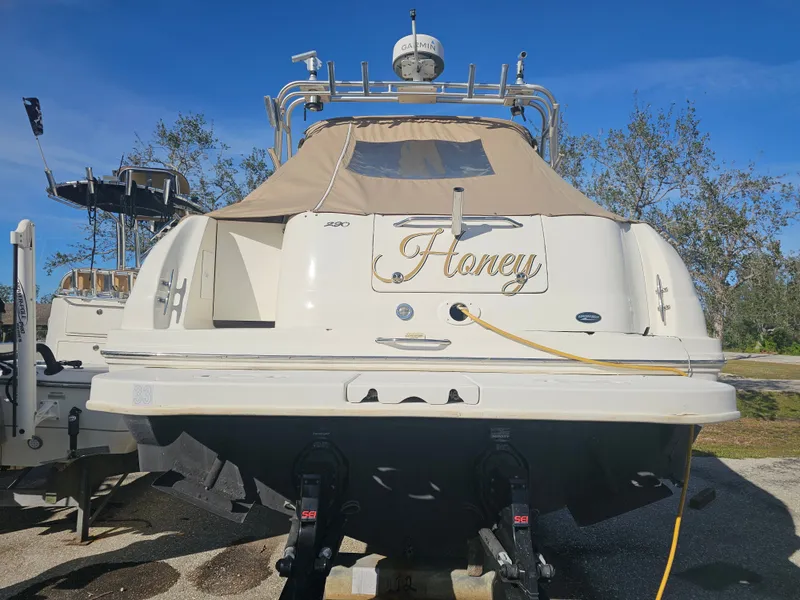 The Sea Ray 290 Amberjack is the answer to the fervent prayers of both sportfishermen and cruising enthusiasts alike. Because the 290 Amberjack is designed to meet several boating criteria, Sea Ray has given careful thought to the cockpit area. It has an open layout and spacious seating with concealed storage for water toys, as well as the wide gunwales and generous freeboard desired for safe and successful sport fishing. The optional fishing package has an aluminum arch with rocket launcher rod holders. The 290 Amberjack is just as carefully planned belowdecks. The spacious cabin provides a comfortable place to relax. Having done its duty as a dining area, the dinette converts to a double berth at night. There's even an extra bunk for additional guests. The galley is well equipped to prepare a snack or quick meal. Its fiberglass countertop has a built-in sink and cutting board. The dual-voltage refrigerator stores sandwich makings, and there's a microwave for warming. The head compartment features a VacuFlush toilet, mirrored vanity with sink and storage below, plus a shower with curtain. The spacious forward berth has storage for large, bulky items underneath, as well as shelf, lots of cabinet space and a mirrored rope locker. A privacy curtain may be drawn, and the screened deck hatch opens to provide natural light, fresh air and ventilation.