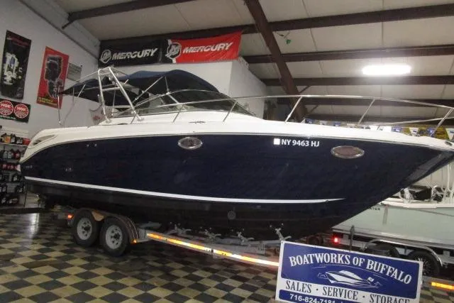 Powered with twin 5.0 MPI and Bravo 3 drives, fresh bottom paint , 2- bimini tops and cockpit cover. Stern shower, cockpit lights,sink and livewell. Fresh water/sea water wash downs, Raymarine AX10M, Garmin Echo Map, Uniden VHF radio and trim tabs. Compass, ac/heat, vacuflush head, fridge, microwave, sink, aft cabin, windlass and side dinette that coverts to a bed. This sale does not include a trailer- shown on our yard trailer- please call for quote.