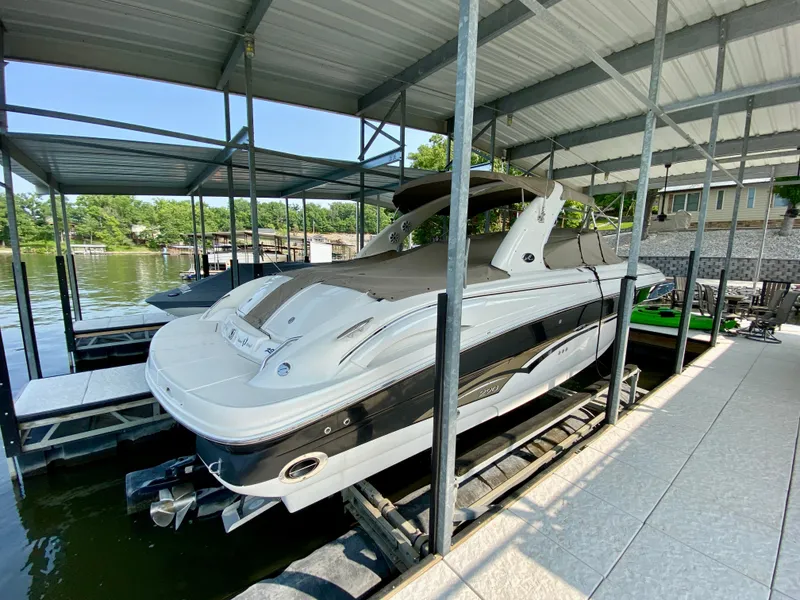 Deck/Hull: Integrated swim platform with walk-thru transom, u-shape seating, wet bar with sink and storage, enclosed pump out head, fenders, ample floor storage, windshield wipers, shore water, wetbar with sink, underwater lights, anchor storage with anchor, radar arch with speakers and bimini top.