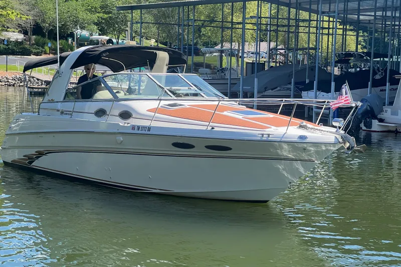With its Arctic white gelcoat, stylish graphics package, lustrous burl wood accents and a fiberglass sport spoiler, it's easy to fall for the Sea Ray 290 Sundancer based on looks alone. But to make sure it's just as appealing from a practical standpoint, Sea Ray included a wealth of operational systems. Consider just the short list: automatic bilge pump, electric bilge blower, power steering, power tilt and trim, Lowrance 3500 digital depth finder, dockside power, even a freshwater washdown with cockpit shower, and concealed dockside water inlet. The large, extended swim platform and transom door makes it easy to board from the dock or the water, especially since the stainless steel swim ladder can be stowed away in its own dedicated compartment. The 290 Sundancer has a powerful standard engine package - twin 4.3L Bravo II MCM stern drives with 190 horsepower to get away from it all, fast. An upgraded list of gas-powered twin and diesel stern drive options are also available for the 2000 model year. The cockpit on the Sea Ray 290 Sundancer was designed for maximum efficiency with features like a self-bailing fiberglass cockpit liner, full instrumentation with weatherproof switches and circuit breaker panel, a high water bilge pump and alarm system at the helm, a covered chart tray forward of helm and a curved, tinted windshield with power vent. Functionality aside, the cockpit was also clearly built for all-day fun with room for family and friends to travel in style. The seating arrangement offers a double helm seat with flip-up thigh-rise bolster for dual driving positions. The aft-facing seat has a storage compartment built into its base. For sun seekers, there's a portside sun lounger that's well cushioned and well within reach of the cockpit wet bar that has its own cooler and faucet. To gain even more space for sunning, an optional aft cockpit table that converts into a sunpad can be added. Finally, the aft bench seat in the stern folds neatly away for easy access to the engine when the gas-assisted hatch is raised. Inside, the spacious cabin of the Sea Ray 290 Sundancer has a four-person dinette that easily converts to extra sleeping space when not in use. There's also a roomy forward V-berth for a comfortable night's rest. Push aside the privacy curtain, set up the stowable V-berth table, toss on the standard throw pillows and there's the perfect conversation area. The cabin area has three deck hatches with screens and sky screen covers, four opening portlights, and four hull windows to keep it light and provide plenty of fresh air. In the mid stateroom, a double bunk provides perfect guest quarters with mirrored bulkheads, a storage cabinet, and a curved sliding window with screen. The 290 Sundancer also features deep stain-resistant 40-ounce carpet, and a Clarion AM-FM digital cassette stereo with amplifier, six speakers and cockpit remote control to further enhance the environment. Durable, easy-to-clean molded fiberglass is used in the galley countertop and sink area with 6' 3” headroom. Sea Ray included all the necessities like a standard dual-voltage refrigerator, recessed two-burner electric stove, a microwave oven and more. The head and vanity feature a full fiberglass enclosed standup head with a shower and curtain, power vent and a VacuFlush toilet with fiberglass settee lid. There's even a water heater and a standard carbon monoxide monitor to complete the list of cabin amenities.