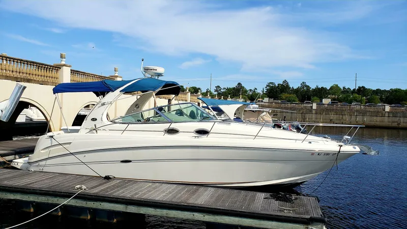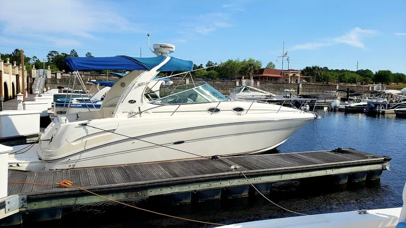 Beautiful, Sea Ray 300, is ready for her next owners to appreciate and enjoy. She is basically a one owner boat, as the current owner bought her a year ago and has not been able to use her due to a surgical procedure. One of the first things you notice about this boat is the incredible amount of space onboard. Whether enjoying a day on the water with family and friends, or doing some overnight cruising, you will find her roomy and comfortable. There is ample seating in the open cockpit, and the interior cabin has a large V-berth forward and an aft cabin with double berth. There is a full galley with refrigerator/freezer, cooktop and microwave along with ample storage space. The private head /shower is aft of the galley, convenient for those below and on deck. Her recently serviced AC/Heat keeps the boat comfortable year round.