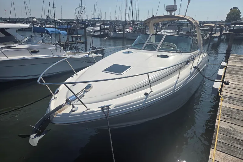 The Sea Ray 300 Sundancer provides luxurious accommodations for six. The galley includes a refrigerator, a recessed stove, a microwave, and voluminous storage. The private head compartment features a VacuFlush head; a vanity with sink, medicine cabinet and storage below; and a full shower with curtain. Sea Ray's raised helm design also allows space for a comfortable conversation area that converts to a berth for overnight guests. The forward double berth has a hanging locker as well as a large and easily accessible storage area. The settee converts also allowing guests to overnight as well. SOME NOTABLE OPTIONS ARE NEW SEA- DEK FLORRING IN THECOCKPIT, TWO SETS OF CANVAS, AIR/HEAT PLUS VERY LOW HOURS .THIS BOAT IS IN ENCREDIBLE CONDTION AS WORDS CAN'T DESCRIBE IT. CALL NOW WITH QUESTONS
