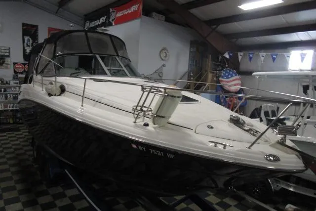 Powered with twin MerCruiser 350 MAG/MPI & Bravo 3 drives with 224 engine hours. Camper canvas, cockpit cover, black bottom paint and Trim tabs. Extended swim platform with swim ladder and Sea Dek, cockpit carpet,sink and fridge. Remote spotlight, TV with DVD player, compass and windlass. Bow fender holders, Halon system, helm bench seat with bolsters, power engine hatch and Raymarine C 70 GPS. A/C/heat, hot water, stereo with helm remote and disc changer, power windshield vent, microwave, fridge, sink and stove top. Vacu Flush toilet, Kohler generator and tons of storage. This sale does not included a trailer- call for quote.