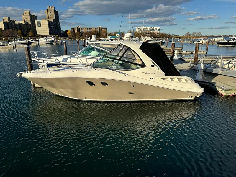 Just "traded in" and fully sorted 2008 Sea Ray 310 with NEW shaft seals, NEW spotlight, NEW hot water heating element, NEW transducer, all canvas and upholstery inspected and repaired as needed! Introduced in 1998, this 2008 310 Sundancer is likely the most well-known version in the Sea Ray line up. It's a midsize express cruiser known for its spacious interior, stylish design and good performance. Features include a deep V hull for smooth rides, large cockpit with an electric grill and wet bar with double wide companion seating and u-shaped rear seating for entertainment. The mid cabin includes AC/Heat, sink, microwave, two burner electric stove, faux granite countertops, refrigerator and separate "chiller" and lots of storage for cutlery, glass, and china. Additionally, she is equipped with a Kohler generator, bow thruster, fully functional Garmin chart plotter / radar and full canvas including a mooring cover. To get you where you need to go, this 310 is powered by the MerCruiser 320hp V-drive inboards with MerCuiser Smart Craft and only 695 original hours. If you are looking for a well-equipped mid-size cruiser with stylish design and performance that can also sleep six comfortably, then you have found the boat for you and your family! Don't miss out on this excellent opportunity offered by Smith Yachts!