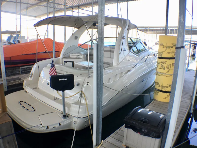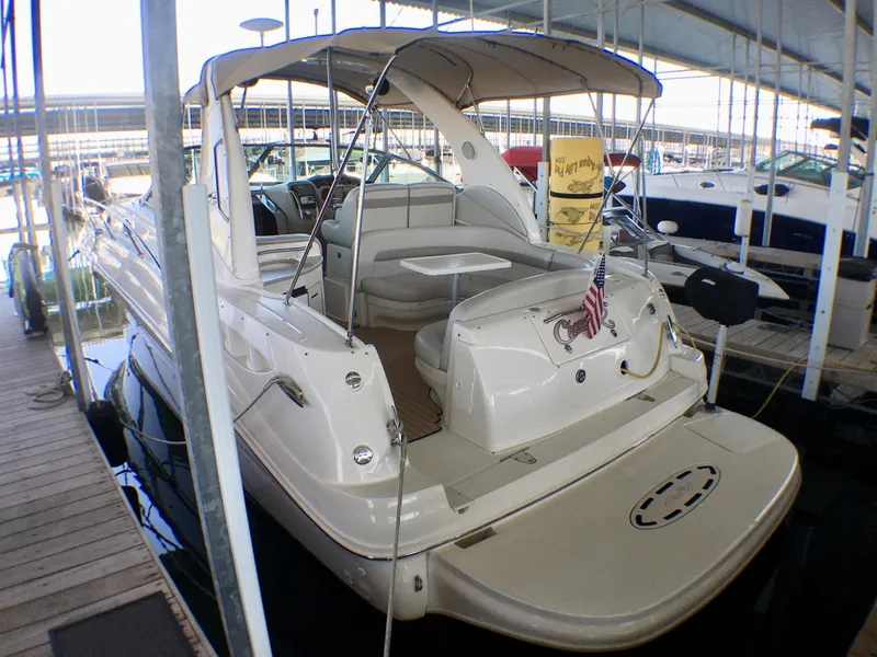 Sea Ray set the standards for express cruisers with these molds in my opinion and for years to come. The 320 Sundancer introduced as a late 2002 model delivered just the right blend of style, comfort, and performance up to the 2007 model year.. Sea Ray's dedication to quality is clearly evident in this boat, from the sporty burlwood dash to her near-flawless gelcoat and premium hardware. Below deck, the 320's interior is brightly lit and completely open. High-gloss cherry paneling and mirrored accents highlight a décor rich in luxury and sophistication. The salon settee converts to a double berth; an island berth is forward, and the mid cabin area aft of the companionway steps serves as a secondary conversation area. Curtains separate both sleeping areas from the main salon, and faux granite counters and Formica cabinets are found in the galley. The Sundancer's cockpit layout is arranged with U-shaped seating aft for four, a stylish dual helm seat with flip-up bolster, and a full wet bar. A second bimini frame has been added for additional shade. Call for an appointment to board your next boat.