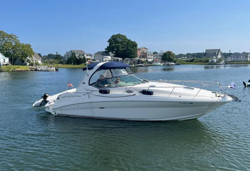 The 320 is literally the perfect family weekend beach getaway boat that won't break the bank. This one is equipped with a genny for sleeping in a meat locker after a day on the hook or at the beach. She is in exceptional condition and floating in Mystic. V- Drives me a pleasure around the docks. Stepping below through a portside companionway, the Sundancer's open-plan interior is notable for its oversized galley to port with cherrywood cabinets and more counter (and storage) space than many larger boats. There are berths for six in the 320 including a comfortable kidney-shaped sofa opposite the galley that converts to a double bed. The sunken mid-cabin area aft serves as a secondary conversation area during the day and a guest stateroom at night. Privacy curtains separate both sleeping areas from the salon.