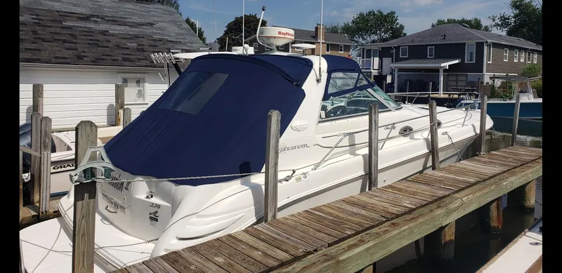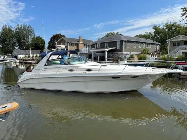 With its distinctive styling, the Sea Ray 330 Sundancer stands apart from the crowd. This 33-footer sleeps six, has a large, versatile cockpit and all the performance anyone ever needs in a family cruiser. With optional twin inboard MerCruiser V-drives in addition to standard twin 5.7L, 260 horsepower MerCruiser V-drives, the 330 Sundancer can be equipped for any adventure. The double helm seat gives captain and navigator a clear view of the water through the tempered glass windshield, which is center-vented to catch sea breezes and provide access to the foredeck. All instrumentation is within easy reach, including the standard VHF radio and Lowrance depth finder. A portside wet bar stands ready to accommodate any cockpit refreshment needs. The convenient fold-down step assists passengers in boarding. Lower the cockpit table, add the filler cushion, and create a sunpad for two. The aft seat is hinged so that the electrically actuated cockpit sole rises for instant access to the engines. Standard canvas package includes Sunbrella bimini top - sun shade with interlocking top extrusion, boot and vertical top storage, front bimini curtains, side curtains, and an aft cover to protect the cockpit. Belowdecks to starboard, a plush sofa provides plenty of room to relax as well as a comfortable dining area. Lower the table, add the plump filler cushion and the sofa turns into a double berth. The mid-stateroom functions as a conversation area during waking hours, then converts to a double berth during sleeping hours. A screened sliding window admits plenty of fresh air and light. The forward stateroom features a double berth, two large mirrored hanging lockers, a TV-VCR combination, and a privacy curtain that encloses the entire area. The head is located just inside the cabin door, providing easy access for passengers in the cockpit, as well as the cabin. The compartment includes a VacuFlush toilet, vanity with sink, and shower with curtain. In the galley, appointments include a large sink, refrigerator, flush-mounted two-burner electric stove, and microwave.
