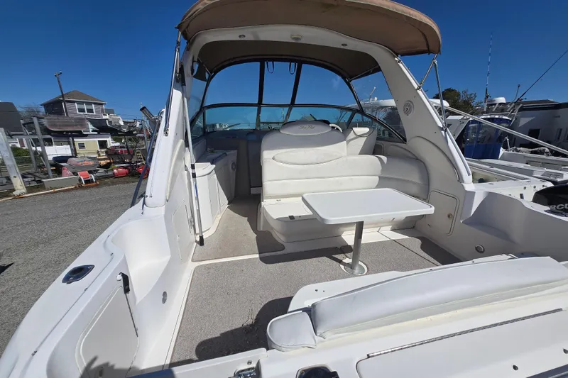 clean well cared for boat! trades considered. loaded with all the standard fare; air, heat, gen, windlass, spotlight, sleeps 6, vacuflush head, nice full canvas, sea dek flooring on the swim platform, carpet in cockpit, gps, depth, vhf, stereo, tv, full galley, twin mercruiser 7.4 mpi v drive 310hp inboards that are fresh water cooled, exhaust risers and manifolds are 3 yrs old, ckpt vinyl upholstery is nice too. interior and exterior is very clean! very clean engine room, power hatch, ckpt shower. a great cruiser and great looking dock queen!