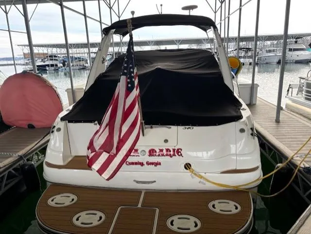 The 340 Sundancer has a large cockpit, a well-appointed cabin, and a serious base power plant, to summarize Sea Ray's finest sport cruiser. Designed for entertaining on a higher scale, the 340 Sundancer features a portside entertainment center complete with wet bar, cooler and icemaker. An optional refrigerator is available in lieu of the icemaker. The cockpit table converts easily to a spacious sun pad by inserting the matching filler cushions. With high-quality marine-grade vinyl, every seat is amazingly comfortable, from the adjustable helm seat with flip-up thigh-rise to the full aft-facing seat with a convenient storage base and cooler. There's also comfortable aft bench seating. Other standards include a self-bailing fiberglass cockpit liner, snap-in carpet, cockpit bolsters and more. Extra gear is neatly stored in an enclosed storage compartment located in the transom wall and equipped with a gas-assisted lid. The Sea Ray 340 Sundancer is impeccably styled to a level only Sea Ray can achieve. The vinyl and carpet have been recently replaced. A standard fiberglass sport spoiler and generous wood accents (including a wood-accent tilt steering wheel) conjure images of a fine yacht. At the helm, the captain has a broad dash that places everything in easy sight and reach, including illuminated weatherproof rocker switches, standard Raytheon VHF radio, digital depth finder, compass, and full backlit instrumentation with a concealed circuit breaker panel. Under the electrically operated engine hatch, the new standard 310 horsepower twin MerCruiser V-drives provide an exceptional ride with responsive handling, thanks in part to the heavy-duty hydraulic steering. The 340 Sundancer also offers a selection of optional twin gas and diesel stern drives, as well as twin gasoline and diesel V-drives. A large sliding acrylic door opens into a cabin that accommodates up to six people on the Sea Ray 340 Sundancer: deep-pile marine carpet, floor storage, flat screen tv, and a Clarion AM-FM digital cassette stereo with six-disc CD changer and eight speakers. The forward stateroom has a full-size berth with two hanging mirrored lockers, a vanity, and plenty of personal storage space. The mid stateroom features Sea Ray's design in which the conversation pit converts to a private double berth. In the salon, a choice of seating plans allows for even more sleeping space with a convertible dinette, or a stylish couch and table with storage below. The galley of the 340 Sundancer features all the comforts of home, including a 3.4-cubic-foot refrigerator, microwave, flush-mount two-burner electric stove, and fiberglass countertop with sink and cutting board cover to create even more usable space. The drawers and storage areas stow dishes, glasses, and flatware securely thanks to special inserts that hold them firmly in place. The fiberglass enclosed standup head with vanity provides a VacuFlush head and shower. The pressure water system and six-gallon water heater make sure that hot water is always available. A carbon monoxide monitor is standard equipment. Among the 340 Sundancer's many other conveniences are a Sunbrella Bimini top and sunshade, which when installed still allows plenty of head room at the helm. An extended swim platform with concealed stainless-steel ladder allows for clutter-free boarding access from the water. There is also dockside power, fresh water washdown with a hot and cold cockpit shower and dockside inlet concealed in the transom. A long options list offers even more ways to customize the 340 Sundancer, including a 12,000 BTU air conditioner and heater, plus a choice of remote-start gas or diesel generators. This well-kept yacht included a customer reclining sun pad, and custom cover. Do not miss your chance to make long lasting memories on the lake. Come see this 2000 Sundancer 340 at Port Royal on Lake Lainer.