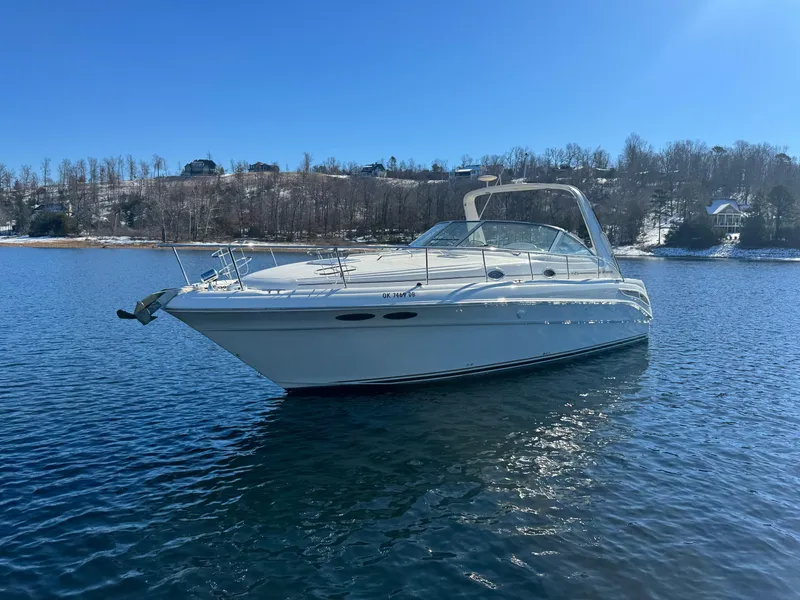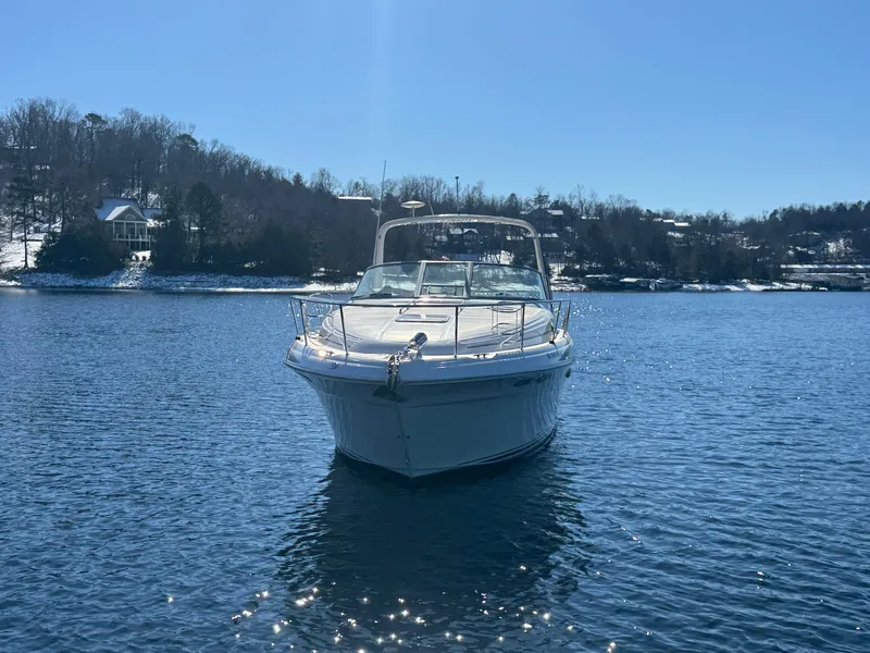 The 340 Sundancer has a large cockpit, a well-appointed cabin, and a serious base power plant, to summarize Sea Ray's finest sport cruiser. Designed for entertaining on a higher scale, the 340 Sundancer features a portside entertainment center. The cockpit table converts easily to a spacious sunpad by inserting the matching filler cushions. With high-quality marine-grade vinyl, every seat is amazingly comfortable, from the adjustable helm seat with flip-up thigh-rise to the full aft-facing seat with a convenient storage base and cooler. There's also comfortable aft bench seating. Extra gear is neatly stored in an enclosed storage compartment located in the transom wall and equipped with a gas-assisted lid. The Sea Ray 340 Sundancer is impeccably styled to a level only Sea Ray can achieve. At the helm, the captain has a broad dash that places everything in easy sight and reach, including illuminated weatherproof rocker switches, standard Raytheon VHF radio, digital depth finder, compass, and full backlit instrumentation with a concealed circuit breaker panel. Under the electrically operated engine hatch, the new standard 310 horsepower twin MerCruiser V-drives provide an exceptional ride with responsive handling, thanks in part to the heavy-duty hydraulic steering. A large sliding acrylic door opens into a cabin that accommodates up to six people on the the Sea Ray 340 Sundancer: deep-pile marine carpet, floor storage, a standard TV, and a Clarion AM-FM with eight speakers. The forward stateroom has a full-size berth with two hanging mirrored lockers, a vanity, and plenty of personal storage space. The mid stateroom features Sea Ray's design in which the conversation pit converts to a private double berth. In the salon, a choice of seating plans allows for even more sleeping space with a convertible dinette, or a stylish couch and table with storage below. The galley of the 340 Sundancer features all the comforts of home, including a 3.4-cubic-foot refrigerator, microwave, flush-mount two-burner electric stove, and fiberglass countertop with sink and cutting board cover to create even more usable space. The drawers and storage areas stow dishes, glasses, and flatware securely thanks to special inserts that hold them firmly in place. The fiberglass enclosed standup head with vanity provides a VacuFlush head and shower. The pressure water system and six-gallon water heater make sure that hot water is always available. A carbon monoxide monitor is standard equipment. Among the 340 Sundancer's many other conveniences are a Sunbrella Bimini top and sun shade, which when installed still allows plenty of head room at the helm. An extended swim platform with concealed stainless steel ladder allows for clutter-free boarding access from the water. There is also dockside power, fresh water washdown with a hot and cold cockpit shower and dockside inlet concealed in the transom. A long options list offers even more ways to customize the 340 Sundancer, including a 12,000 BTU air conditioner and heater, plus a choice of remote-start gas or diesel generators.