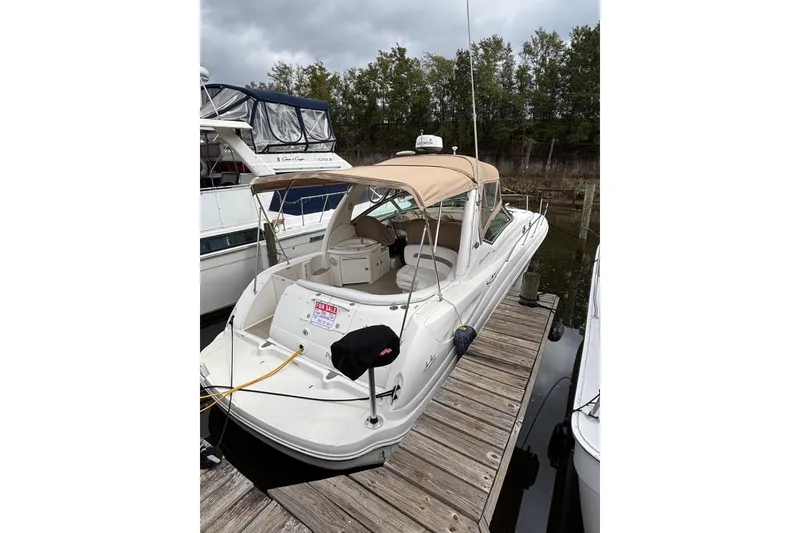 The 340 Sundancer is one of Sea Ray's most popular models, known for its solid construction, comfortable layout, and excellent performance. The V-drive setup provides a noticeably better ride compared to stern drives, especially in rougher water, while still offering impressive maneuverability around the dock.