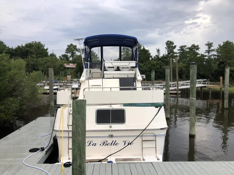 A very popular boat during her late 1980s production years, the Sea Ray 360 Aft Cabin was built on a “dual mode” hull capable of trawler-style economy at 7–8 knot displacement speeds while still able to achieve planing-speed performance. She rides on a low-deadrise, solid fiberglass hull with moderate beam, prop pockets, and a shallow, full-length keel. The 360’s interior is somewhat unusual in that twin single berths were standard into the smallish aft stateroom (although a double berth was optional). The galley is down, separated from the salon by a serving counter, and a portside lower helm was a popular option. Teak cabinets and paneling and vinyl overheads highlight the interior. Topside, the 360’s full-width aft deck is on the small side with room for only a couple of deck chairs. Wide side decks make it easy to get around, and the flybridge is arranged with bench seating aft of the helm. Note that most of these boats were sold with an optional hardtop. Standard 260hp MerCruiser gas engines cruise the 360 Aft Cabin at a modest 15 knots and reach a top speed of 23–24 knots. Optional 200hp Perkins diesels provide a cruising speed of 15–16 knots (about 20 top).