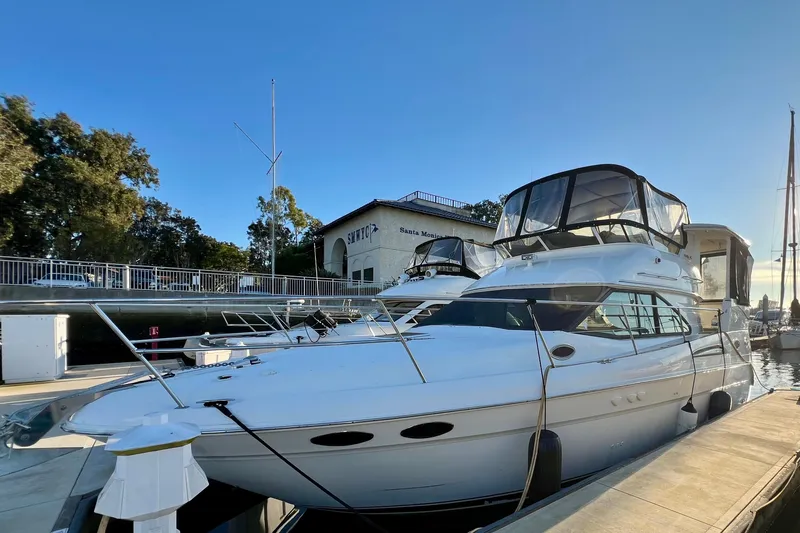 The 1997 Sea Ray 370 Aft Cabin delivers exceptional safety and reliability for discerning boat buyers seeking a trustworthy cruiser. Built on a robust, fully cored deep-V hull with prop pockets for efficient performance, this 38-foot motoryacht features welded stainless steel stanchions, through-bolted handrails, and a secure bow rail to ensure safe movement fore and aft, even in choppy conditions. Twin MerCruiser inboard engines provide dependable power with a proven track record, while the wide 14'3" beam and high freeboard offer outstanding stability and confidence underway. Sea Ray's reputation for solid construction shines through in this model, making it a reliable choice for extended cruising without constant worry.Step aboard and experience unparalleled spaciousness and thoughtful innovation designed for comfortable long-range cruising. The expansive interior boasts two private staterooms-each with walkaround double/queen beds, generous cedar-lined storage, and en-suite heads with stall showers-plus a convertible salon sofa for additional guests. The full galley includes modern conveniences like a refrigerator/freezer, electric stove, and microwave, while the large salon, entertainment center, and covered aft deck with wet bar create inviting spaces for relaxation and entertaining. Innovative features like the center helm with burl panels, tinted Venturi windshield, and efficient layout maximize livability in a mid-size cruiser, perfect for weekend escapes or extended voyages where comfort and roominess matter most.