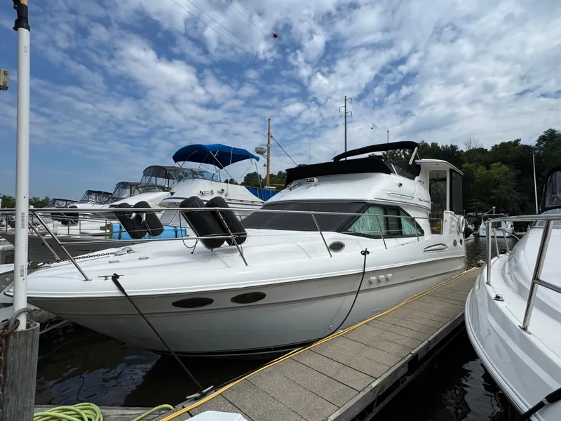 The Sea Ray 370 Aft Cabin is a sport yacht that enables you to spend the night away from home. Powered by twin 7.4L MerCruiser inboards, the 370 Aft Cabin features a center helm station with burl instrument panels, custom slide - swivel helm seats and an aft-facing sun lounger and bench seat with storage below. A wide 14-foot, three-inch beam enables the 370 Aft Cabin to provide ample, level walkways to the foredeck on both port and starboard sides. Welded stainless steel stanchions with through-bolted stainless steel handrails and bow rail ensure passengers a safe trip forward and aft. The spacious aft deck is covered by a fiberglass hardtop, has port and starboard entrance doors, and can be fully enclosed by custom side and aft skirts. This deck features 12-volt lighting, a built-in wet bar with sink, beverage holders, and trash receptacle. Access the bridge from the aft deck via portside molded steps. Two adjustable captain's chairs face the helm station. Guests can relax on the bench seat or the forward-facing sun lounger on the starboard side. The aluminum-framed Venturi windshield is tinted for optimum viewing. The center helm station has burl instrument panels with custom backlit instrumentation and a Raytheon electronics package that includes a VHF radio and Raydata multifunction instrument with depth finder, speed - sumlog, and water temperature. Below decks, there's a large salon with an L-shaped sofa, a dining - cocktail table and an entertainment center. Guests can relax in a comfortable barrel chair and enjoy the built-in 20-inch color TV - VCR combo with remote and Clarion digital AM - FM cassette stereo. The L-shaped sofa has an electrically operated slide-out bed to accommodate overnight guests. The pedestal dining - cocktail table stores out of sight when not in use. In the aft master stateroom, a queen-size bed with innerspring mattress ensures maximum comfort. Cedar-lined closets and a hanging locker with mirrored doors provide plenty of room for clothing. The en suite head has a VacuFlush toilet, Corian vanity with sink, and shower with seat and bifold door. The forward stateroom features a full-size pedestal bed, cedar-lined hanging lockers with mirrored doors, side shelf storage, a privacy door, and private access to the main head. The forward head compartment features a VacuFlush toilet, molded vanity with sink and Corian countertop, and pullout shower wand. The port stateroom features a twin bed and built-in storage. The galley has a 7.4-cubic-foot refrigerator - freezer, flush-mounted three-burner electric stove, and microwave - convection oven.