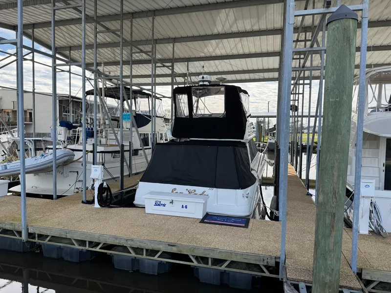 he Sea Ray 370 Sedan is a great multi- purpose vessel. As a first level sport yacht, she has 360 degree visibility from a large salon with wrap around windows, including a full length settee and breakfast bar. The split level interior offers two private staterooms both with double births, full galley and head with separate shower. She also makes a great fishing boat that is good inside or offshore. The prop pocket design offers a shallow draft (2'7") for inside fishing with a full-beam 7' cockpit. The bridge has and an "L" shaped lounge and is great for spotting the diving birds. This fresh water kept vessel is a one owner boat. One who understands the value of a solid maintenance program. She comfortably cruises at 22-25 mph at 32-3500 RPM. Hit Print this one is worth seeing.