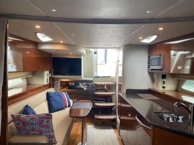 The 370 Sundancer. The generous dimensions of this express-style boat make it exceptionally qualified for cruising and entertaining, and an extensive list of sterndrives or inboards, gas or diesel, lets you choose your preferred power. A roomy interior with forward V-berth, big mid-stateroom and convertible salon sofa can sleep six in comfort. Plus there's a full galley and head.
