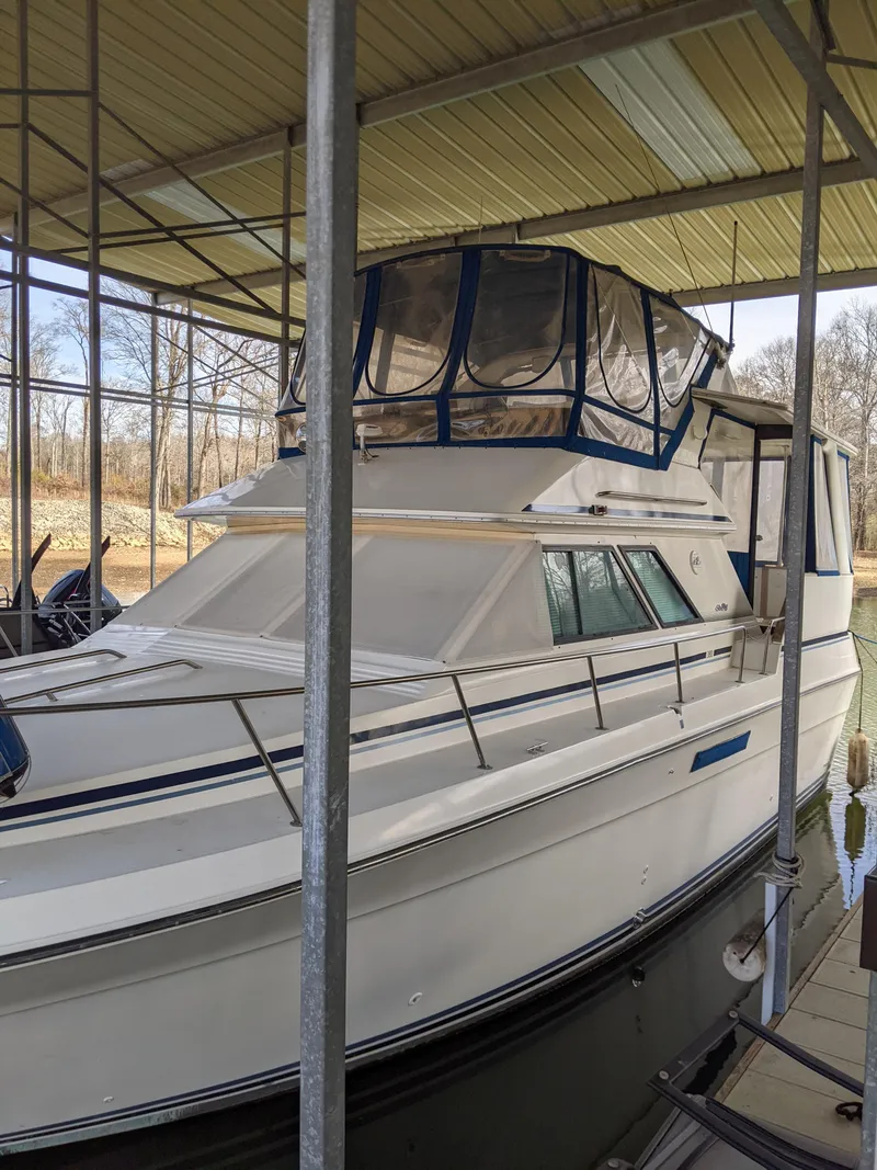 The 1989 38' Sea Ray 380 Aft Cabin is a bigger boat inside than her 38-foot length might suggest thanks to a wide 13-foot, 11-inch beam. Her spacious accommodations include two staterooms, a large U-shaped galley with an upright refrigerator and plenty of storage. A convenient breakfast bar overlooks the galley area. This boat also has the lower helm option. The 380's layout includes everything required for comfortable cruising including a sofa in the salon, storage and built-in vanities in both staterooms. Topside, a hardtop shelters the aft deck, and the flybridge includes guest seating aft of the helm. Additional features include side-dumping exhausts, wide sidedecks, a spacious engine room & radar arch.