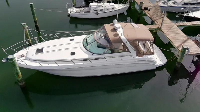 This 380 Sundancer shows super clean both inside and out. The sellers have loved this boat and it shows. Great camper canvas, newer teak inlay cockpit carpet, & updated Raymarine electronics with radar. Cherry interior and spotless inside without any musty boat smells. . Twin 380hp Mercruiser Horizon's with 1295 hours.