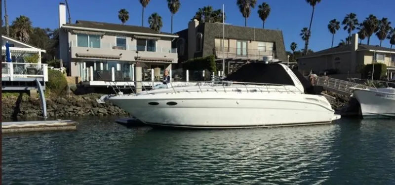 The Sea Ray 380 feathers a Deep Vee hull for a very stable ride and twin Mer cruiser V drive V-8 engines for plenty of power. The vessel is ideal for both two couples or a family week end at Catalina or beyond. The Sea Ray 380 with a 13 ft beam has sleeping accommodations both fore and aft and also a salon settee which can also be turned into a berth. The galley has a full sized Norcold fridge/freezer, Panasonic microwave and two burner Kenyon cooktop The Sea Ray 380 has one head with Vac-u-flush toilet, and a separate stall shower not normally found in Vessels this size. The head also has a separate entrance from the forward stateroom.