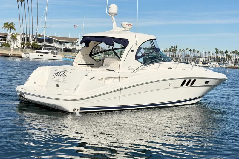 New to the market ALIBI is a desirable and meticulously maintained 2008 40 Sundancer. She is powered by twin low hour Cummins QSB 5.9 420HP's with only 811 hours! Onan Genset 12KW. She offers all one could ask for in a cruiser of it's size and category. Offering a forward and aft stateroom, head with separate shower, full galley, and much more for all of your overnight and cruising needs. She is well equipped and updated with Raymarine E120 GPS, Raymarine Axiom Plus 12 combo Chart Plotter. Raymarine Autopilot, bow and stern thrusters, upgraded stereo, cockpit TV, KVH Tracvision and Ice maker. Air Conditioned cockpit and interior, cockpit wet bar, custom aft cockpit seating. Full canvas w/ custom aft awning, cockpit seats and instrument covers. This boat truly needs to be seen to be appreciated!