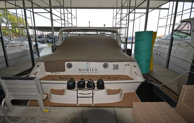 cockpit seats a small crowd. Twin 340hp gas inboards cruise at 18 knots. Always undercover and in