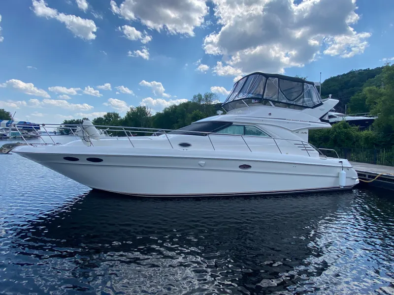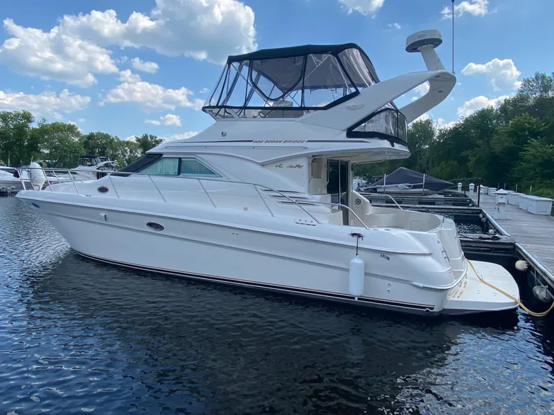 Exceptionally clean FRESHWATER Sea Ray 400 Sedan Bridge is now available for immediate sale and delivery! Low hours (756) on twin freshwater cooled Mercruiser 7.4 Horizon V-Drive inboards. The engine room is spotlessly maintained and kept by meticulous owners. A lot of upgrades and enhancements have been completed. Owners have found their new vessel. Don't miss the opportunity to own one of Sea Ray's most popular and best selling models of all time.