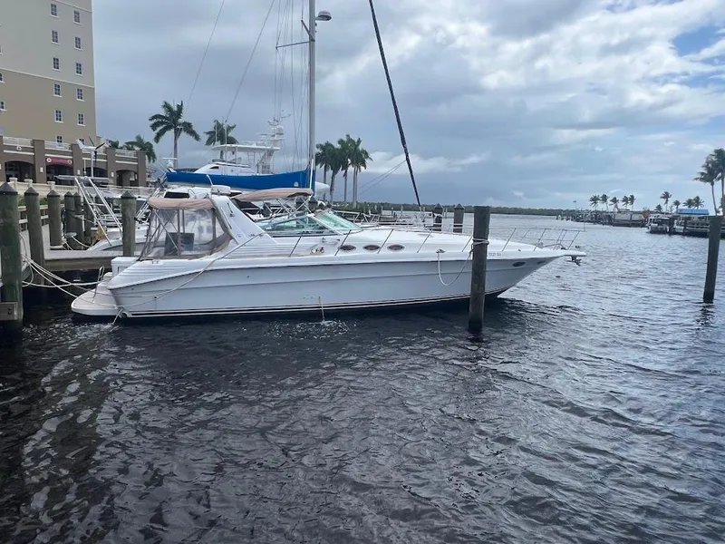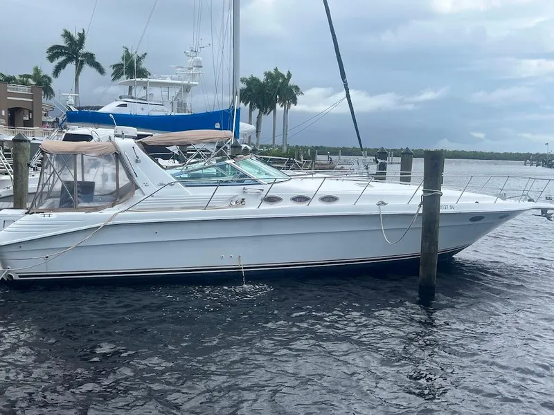 Manufacturer Provided DescriptionWhether for weekend excursions or extended cruising, the Sea Ray 400 Sundancer is the one. The distinctive styling begins with the 400 Sundancer's mid-cabin, raised-helm design. A fiberglass sport spoiler with overhead lighting, generous seating arrangement, and portside wet bar make the cockpit an inviting place to pass time with friends. The 400 Sundancer is powered by twin 7.4-liter, 380-hp - 283-KW, MPI Horizon MerCruiser V-drives. The large cockpit area has bench seating on three sides and a portside wet bar with faucet and icemaker, making it ideal for large gatherings. A transom door leads to the wide swim platform. At the helm, a double companion seat keeps company with the adjustable captain's chair. The Raytheon electronics package includes GPS, VHF radio, and Raydata multifunction depth finder, speed - sumlog, and water temperature instrument. The forward deck sunpad gives sun worshipers a place to relax. The built-in French toe-rail and through-bolted stainless steel bow rail make passage to the foredeck sure and safe. Below, the salon area features a curved sofa, perfect for relaxing before dinner; add the fiberglass table and it's a perfect dining spot. Later, it becomes the perfect sleeping spot for overnight guests. With central heat, air conditioning, and TV - VCR - radio combo, this is your home away from home. The Sundancer berth, or mid-stateroom, is a conversation area during the day and converts to a double berth at night. In the master stateroom is a full-size pedestal bed and a private entertainment center with TV - VCR - radio combination. Cedar-lined hanging lockers and port and starboard vanities with cabinets below provide plenty of storage. With access from the salon and the forward stateroom, the master head includes a VacuFlush toilet, a vanity with sink, and full stand-up fiberglass shower. The guest head features a VacuFlush toilet and vanity with sink. Faux-granite countertops accent the full galley, featuring a full-size refrigerator - freezer, flush-mount three-burner electric stove and microwave, and convenience package with coffeemaker and blender.