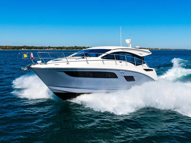 "Double Seas" is a stunning example that's been exclusively run on Lake Michigan since new. She's been well cared for and used sparingly, with only 99 hours to date! Entering the salon you'll be welcomed by contrasting sofa seating for up to 8 guests, and a full galley along the port side. At the helm, a double captains chair sits across from dual Raymarine chartplotters with radar. A few steps down you'll find the master state room with a walkaround queen berth that has an upgraded, top of the line mattress, and a private ensuite head. Optioned new with the dual head layout, both feature stall showers with teak floor inserts. Just below the salon is a twin berth that can be turned into a queen berth, and the optional cabinetry with storage along the starboard side. Look no further if you are in the market for a vessel that checks all of the boxes!!
