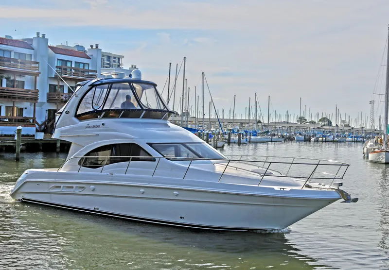 A stunning example of this gorgeous design, the Sea Ray 44 Sedan Bridge is an exceptional yacht with deluxe accommodations and top-quality construction. She boasts an up-scale two stateroom/two head interior with cherry cabinetry and a unique raised salon dinette with panoramic views. Further she has a large flybridge accessed from the cockpit by an easily navigated staircase. Her centerline forward helm position provides excellent visibility for the captain. Additionally, her large cockpit has safe high sides and a complete overhang. She has truly achieved the best-in-class styling.