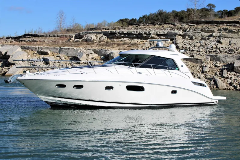 2012 Sea Ray 450 Sundancer - A Beauty! Powered by twin Cummins QSB 380 HO diesels, 457/441 hours. Zeus pod drives. Mercury Marine SmartCraft joystick control. Hydraulic trim tabs. Onan 11.5 kW generator, 401 hours. Battery bank with ProMariner battery chargers and switches. 50 AMP shore power with retractable 40 ft. cord. Electric windlass. Raymarine GPS, chartplotter, radar. VesselView display. TracVision digital satellite system. Full isinglass and canvas enclosure with AC cools the cockpit in hot summer months! Cockpit seating includes a bolstered double helm seat, a double companion seat, and wrap around sofa. Entertain using the refreshment center - sink, refrigerator, and electric grill. Add to that the dining table, flatscreen TV, Sony stereo system, and retractable sunroof! Extra-large swim platform. Transom shower for a hot or cool water rinse. Step up from the cockpit onto the side passageway to the bow where there are sun pads for great views and relaxation!