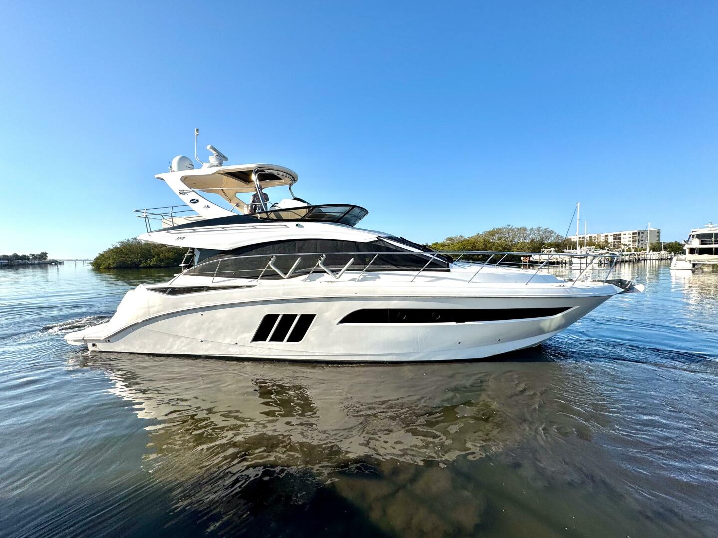 "Bateau d'amis" is a very well maintained 2016 Sea Ray 510 Fly complete with a multitude of upgrades, with recent services including detailed inside/out, annual services performed make this a turnkey ready to go Vessel. She has only 640 hours on her twin Zesus 600 engines and is ready to be seen. With Newer soft goods including Salon Leather Interior and Exterior coverings she shows very well. Including Custom Prana Mattresses Upgraded Appliances New Underwater Lights, Comfortable on your feet Sea Deck, Track Vision Direct TV, Aft Swim Ladder Sea Recovery Mounted in Engine Room