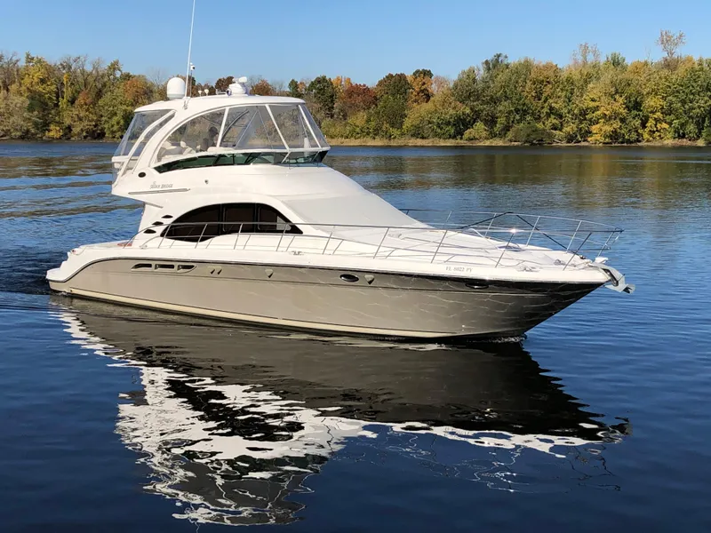 The Sea Ray 52 Sedan Bridge is so beautifully designed and fully equipped, it's virtually in a class all its own. Outfitted with a fiberglass hardtop, Isenglass enclosure and optional bridge air conditioning, this impressive yacht demands attention wherever it goes. Elegant features include wood flooring, fully adjustable thigh-rise helm seating, master and port staterooms with flat screen TVs and two full head compartments with separate showers.