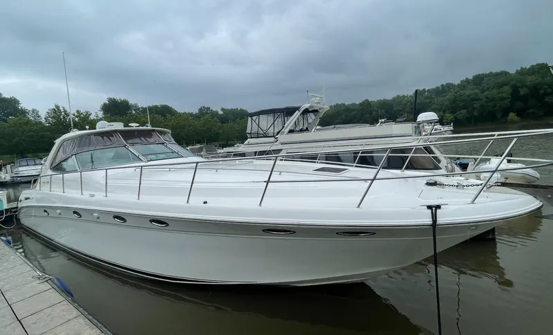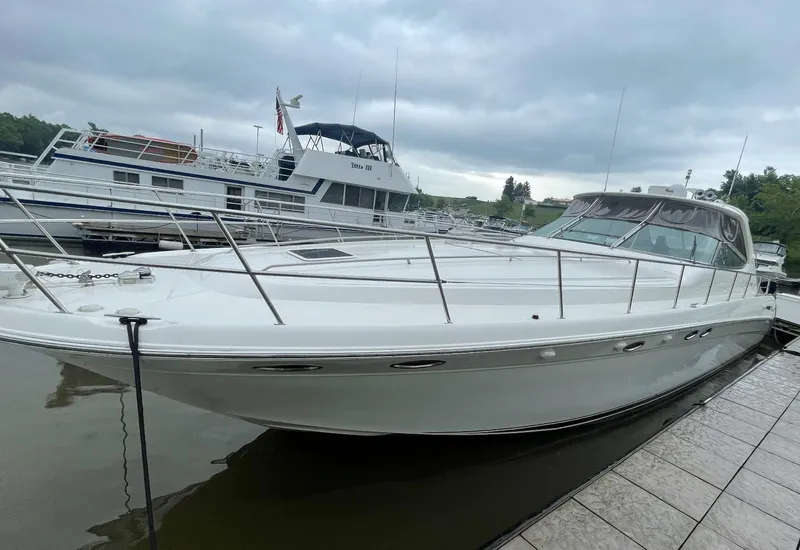 The Sea Ray 540 Sundancer, with its raised helm area design, gives the same amount of privacy and cabin space expected on an aft-cabin model, yet with all the open cockpit room of an express cruiser. On deck, the cockpit of the 540 Sundancer has a stylish sport spoiler, custom slide - swivel flip-up helm seat and Euro-styled companion bench seat. The U-shaped seating area has an electrically actuated retractable sunpad and there's an optional recessed sunpad available for the fore deck too. Even though the 540 Sundancer can be comfortably handled by two, you'll most likely want to share the wealth of standard features with family and friends, including a wet bar with cooler and icemaker, an aft cockpit sun shade, cable TV outlet and a Clarion AM-FM digital cassette stereo with six-disc CD changer subwoofer, amplifier, four speakers, and cockpit remote control. Even with so much of the cockpit dedicated to passenger space, there's also abundant room for personal gear in the port and starboard side compartments and docking equipment stows away neatly in the aft deck. The large private cabin of the 540 Sundancer is just as well-appointed as the cockpit with granite-colored countertops, dimmable lighting, and handcrafted wood trim in either vitricor cherry or clear maple finishes. Custom curtains, deep-pile stain-resistant carpet and concealed floor storage accentuate the modern decor. The mid-ship master stateroom has a queen-size bed with innerspring mattress and a gas-assisted hatch that reveals carpeted storage underneath. There's also a standard entertainment center with a TV - VCR - radio combination and a Bose Acoustimass 3 speaker system with remote control. A full-size bed and additional storage space make the guest stateroom perfect company. Both the master and guest head areas offer a VacuFlush head, power vents, striking cultured marble flooring, and Corian countertops with Grohe designer faucets. In the salon, a curved Ultraleather HP sofa cleverly hides an electric slide-out bed. There's even a concealed privacy curtain that pulls out when needed. The hidden, but complete galley has a three-burner cooktop, refrigerator - freezer with icemaker microwave - convection oven and a convenience package featuring a Spacemaker coffeemaker. In fact, all the comforts of home are present in the 540 Sundancer, right down to the standard washer - dryer combination and salon entertainment center with a color TV - VCR with remote and a Bose Lifestyle 20 stereo system with Jewel Cube speakers and LS bass module. From a technical standpoint, this boat is a masterpiece with responsive twin Detroit Diesel 6V-92TA inboards (T535-hp - 399-kW) and every control needed for unquestionably smooth sailing including a full Raytheon electronics package. The 540 Sundancer has a multiplexed digital LCC systems monitor for quick engine diagnostics and pump monitoring. The 12.5 kW Westerbeke remote generator has its own instrument panel, and there are also four large 8-D batteries with main battery solenoids and a distribution panel for power monitor The new 540 Sundancer has a hydraulic lift swim platform, fiberglass hardtop, and a multitude of engine and electronic upgrades.