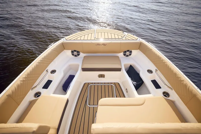 COMFORT MEETS CAPABILITY- A reclining cockpit backrest expands the aft sunpad and gives room to spread out and soak in the sun. Helm and portside seat backrests convert to give full versatility to the cockpit layout. The ample starboard interior storage space under the helm can be upgraded to add a head, further extending your day on the water.